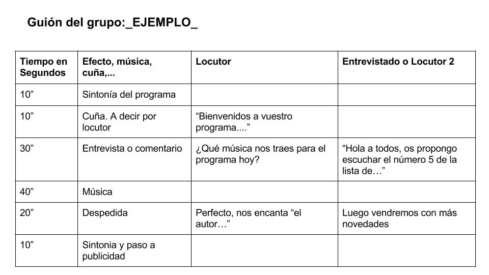 Finalmente con un nuevo documento que he generado y os dejo para compartir, aquí, vamos a desarrollar el guión de cada grupo. En él diferenciamos, el tiempo que debemos utilizar, qué tipo de recurso a realizar (cuña, música…), y los locutores o entrevistados que participan. Un ejemplo: