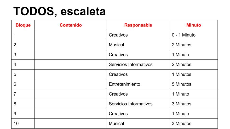 A contnuación trabajaremos en borrador cada uno de los bloques de la escaleta del programa.