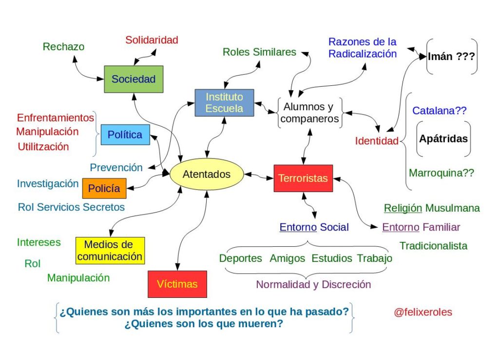 | Como apoyo, puedes utilizar este esquema que he hecho para representar todas las relaciones en torno a los atentados y crear debate con los alumnos.
