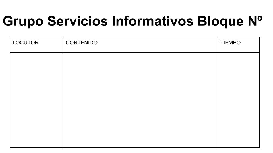 Finalmente con un nuevo documento que he generado y os dejo para compartir, aquí, vamos a desarrollar el guión de cada grupo. En él diferenciamos, el tiempo que debemos utilizar, qué tipo de recurso a realizar (cuña, música…), y los locutores o entrevistados que participan. Un ejemplo: