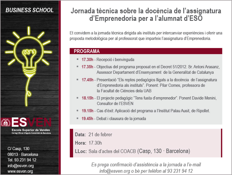 El próximo día 21 de febrero a las 17:30 horas, en la Sala de Actos del COACB, se realiza una jornada sobre la docencia técnica de la asignatura de emprendimiento en la ESO y Educación Secundaria.