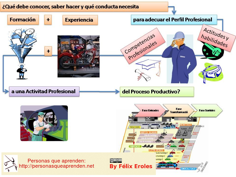Si examinamos el mundo de trabajo y sus procesos productivos, vemos que las empresas definen (o deberían definir) cuáles son su procesos. Cada proceso se subdivide en subprocesos y procedimientos. La sucesión de determinados procesos pueden conformar una Actividad Profesional, por ejemplo: escritor de guiones televisivos. En este ejemplo, el Sector sería el de los AudioVisuales, los procesos productivos, todos aquellos que tienen como objeto producir bienes y servicios para la industria audiovisual. Pero para ocupar una Actividad Profesional necesitamos personas, y dichas personas deben tener una serie de conocimientos, habilidades, experiencia y actitudes que son las que se necesitan para realizar dicha Actividad Profesional. Por eso, las empresas buscan personaras que tengan un determinado Perfil Profesional que se adecue o encaje de la forma más aproximada posible a las actividades (Procesos y Procedimientos) que se realizan en dicha Actividad Profesional.